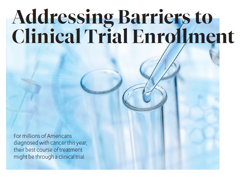 Clinical trials offer patients with difficult-to-treat forms of cancer a chance to receive the most up-to-date and promising care available with the prospects of improved health outcomes and the benefit of advancing medical research. Most patients express a willingness to participate in clinical research, yet only a small fraction ultimately end up enrolling in a trial due to barriers that make participation difficult or even impossible. Consequently, approximately 20% of cancer clinical trials fail due to insufficient patient enrollment.