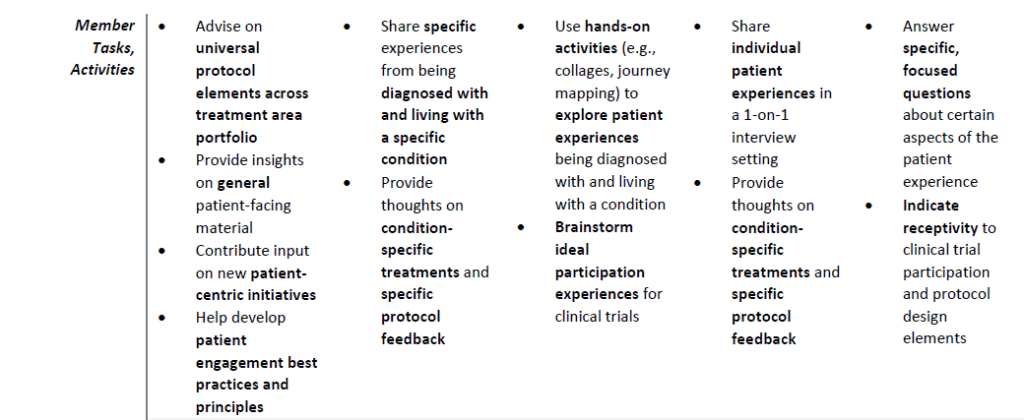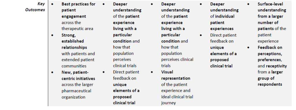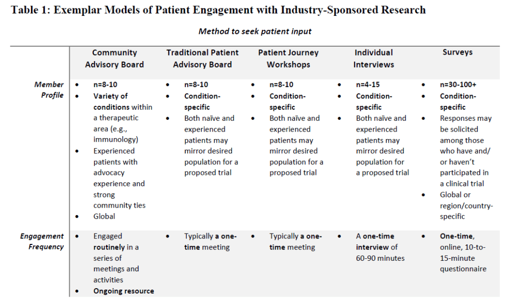 Engaging a neutral third party to serve as primary contact for patients, ensure well-planned meeting objectives and agendas, and collate feedback helped achieve quality engagements and effectively summarize feedback.