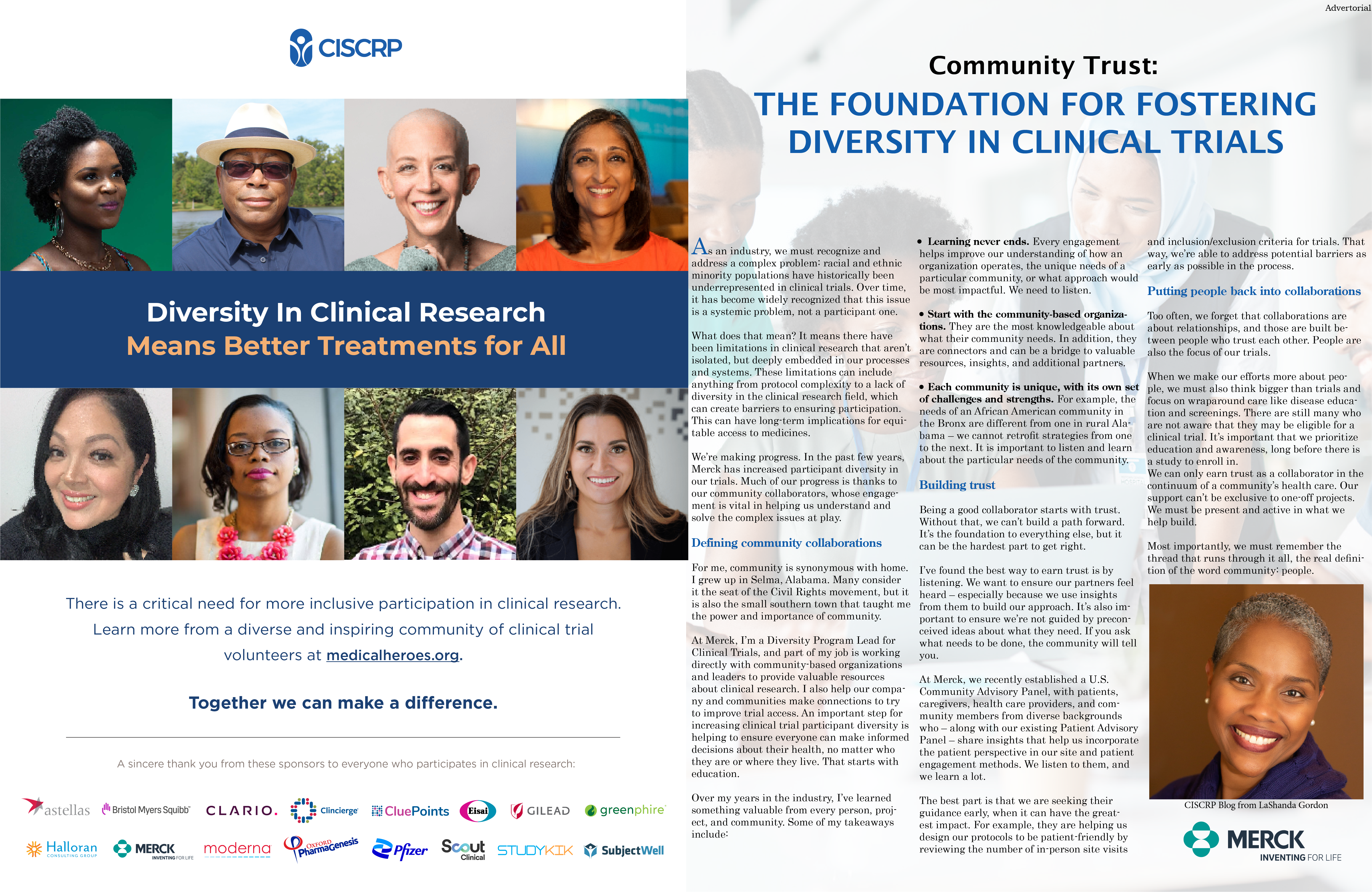 This is an endeavor to celebrate, though we must remember that the path ahead is still quite long. I have every confidence that the CISCRP team’s dedication in ensuring every voice is heard, every story is valued, and every individual is embraced within the scientific arena will be resolute. I commend them on, and deeply appreciate, their quest for engaged representation and inclusivity in clinical trials for all. It is a true honor to work with this team and contribute to their meaningful efforts as THE leader in patient engagement, clinical research education, and clinical trial research and participation.