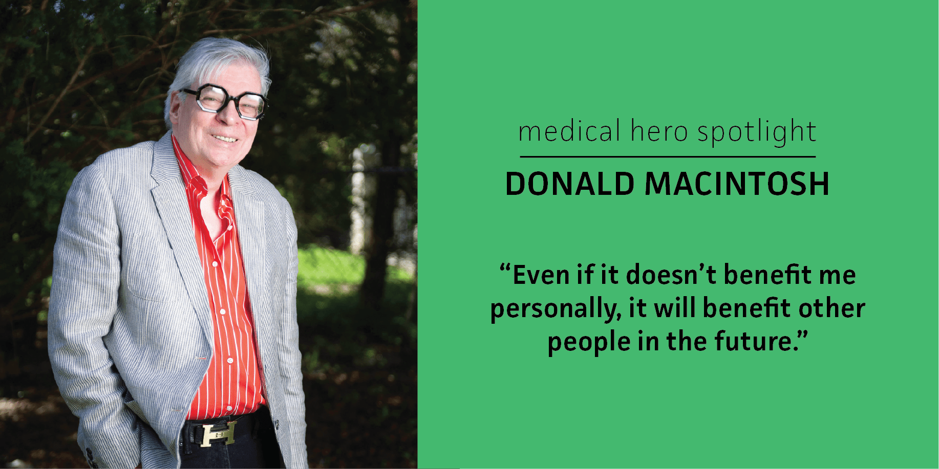 MacIntosh, who remains optimistic, is looking forward to potentially participating in other clinical trials in the future. He encourages other patients to participate, too, explaining there are many benefits including regular exams, free medication, and MRIs.